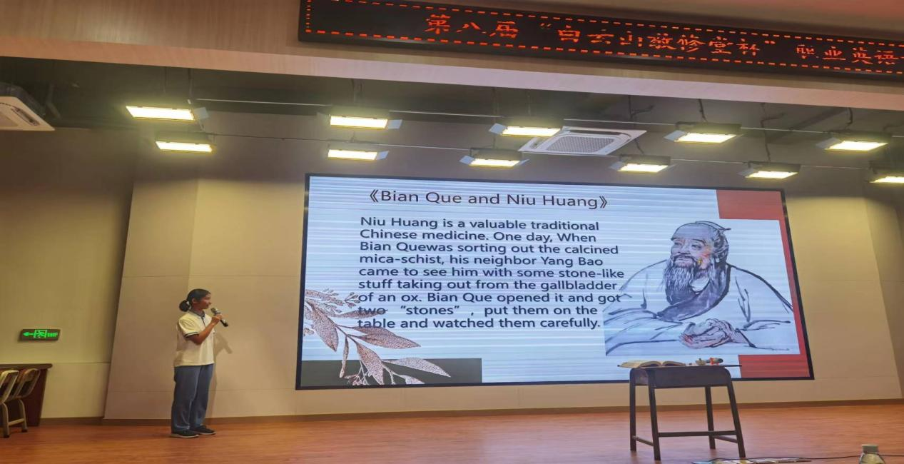 三、体现专业特色,融专业性和知识性为一体。本次职业英语竞赛面向20级和21级中高职学生,参赛选手来自于学校制药系,医护系,药学系,医工系和食化系十个专业的学生,体现了专业性和知识性为一体,英语口语与职业教育一体的融合。其中,21高职中药1班的英语小故事Bian Que and Niu Huang讲述了古代名医扁鹊的故事,并结合表演展示了扁鹊如何在总结在前人的经验之上,通过探索和试验总结出“望、闻、问、切”四诊合参的方法,从而奠定了中医临床诊断和治疗的基础。21高职护理班的庞文晶的演讲My Hero分享了现代护理事业的奠基人南丁格尔的故事,传达了她作为护理专业的一位学生立志想成为南丁格尔这样“没有翅膀的真善美化化身的天使”的护理人的职业理想。这些节目的选手同学们均结合自己的专业传达了自己的职业理想,传达了热爱自己专业并立志于成为中华医学医护传承者的美好信念。